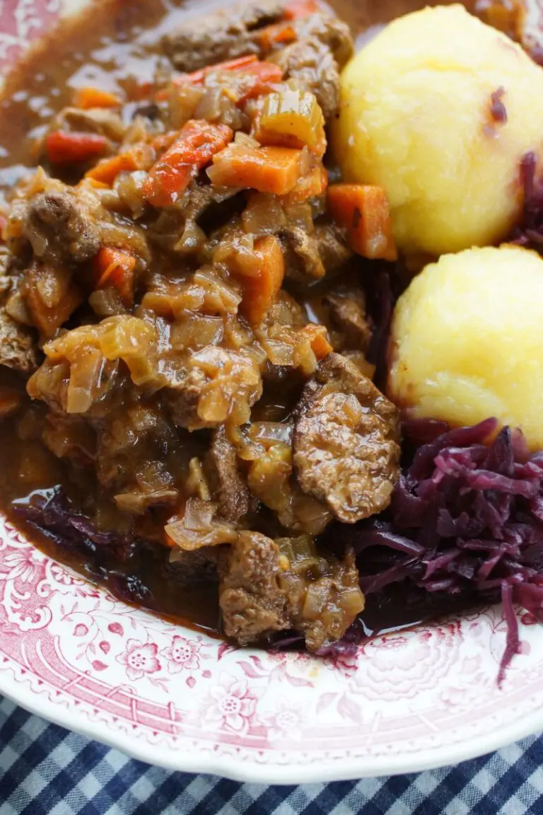 Jetzt kannst Du das Gulasch mit den von dir bevorzugten Beilagen anrichten und servieren. Guten Appetit!